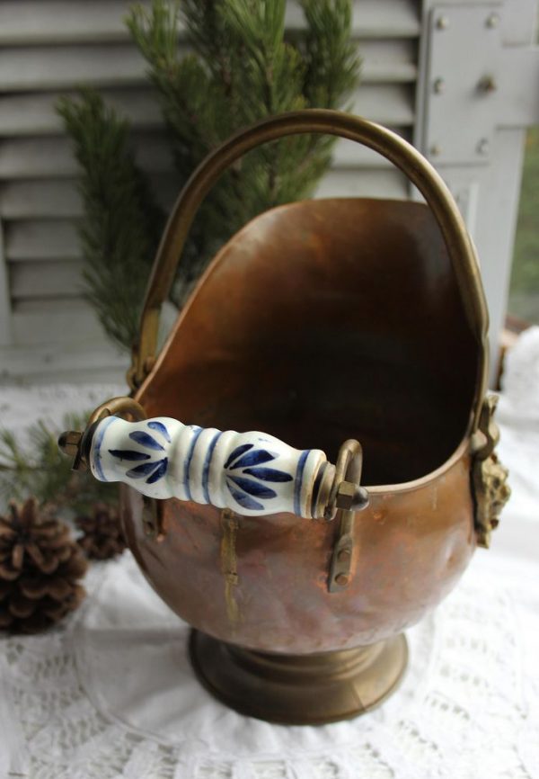 Die alte Kupferkanne rund ist sehr hübsch gestaltet: mit einem wunderschönen Griff aus Porzellan und entzückenden kleinen Löwenköpfen aus Messing an der Seite. Der runde Fuß ist ebenfalls aus Messing. Er hat einen kleinen Riss (s. Foto).