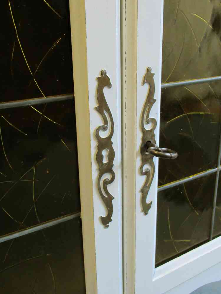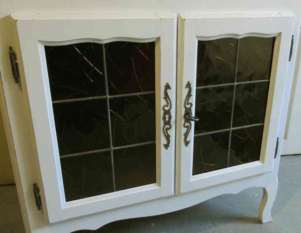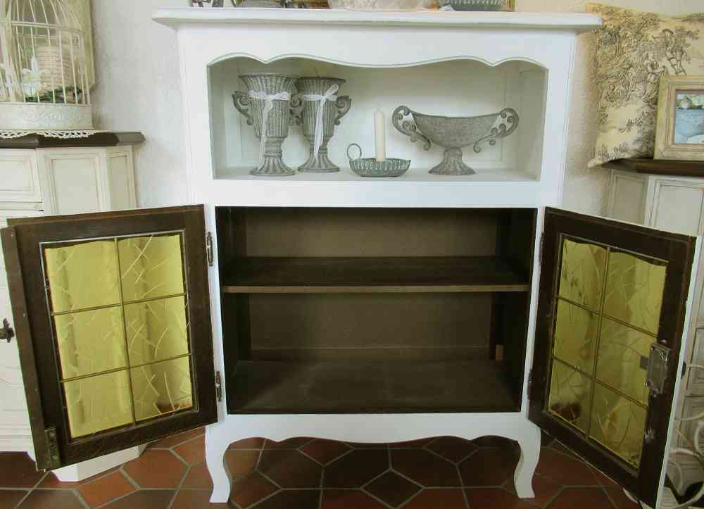 Im unteren Bereich befinden sich zwei Türen mit der Original-Glas-Einlage: bestehend aus kleinen Glasstücken, die in Blei eingefasst sind. Eine schöne alte Handwerksarbeit, die ich selbstverständlich so belassen habe. Dahinter befindet sich ein Einlageboden.