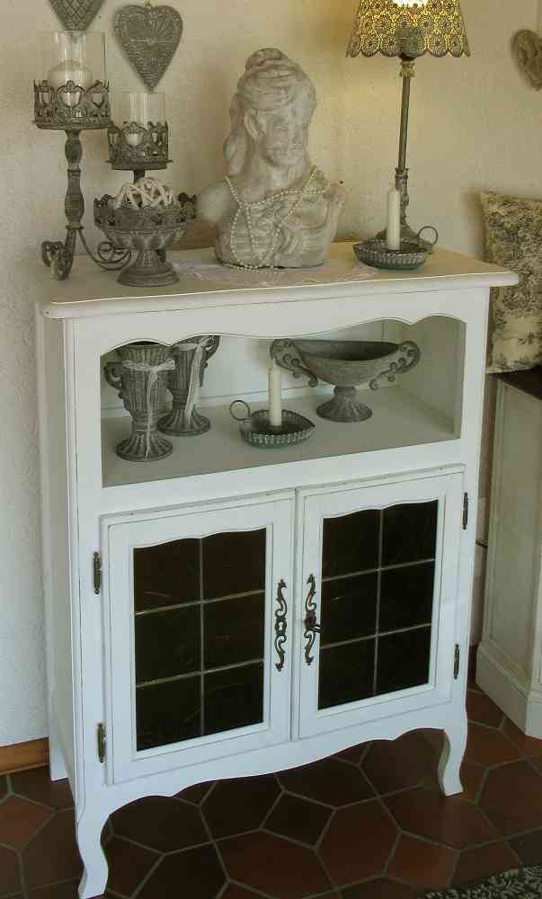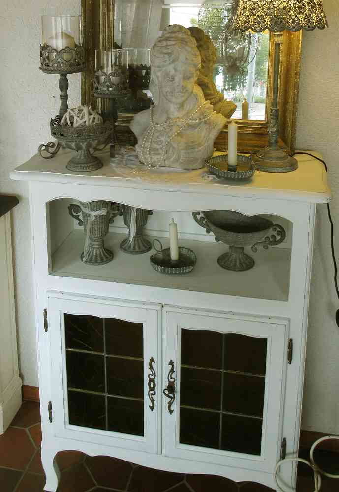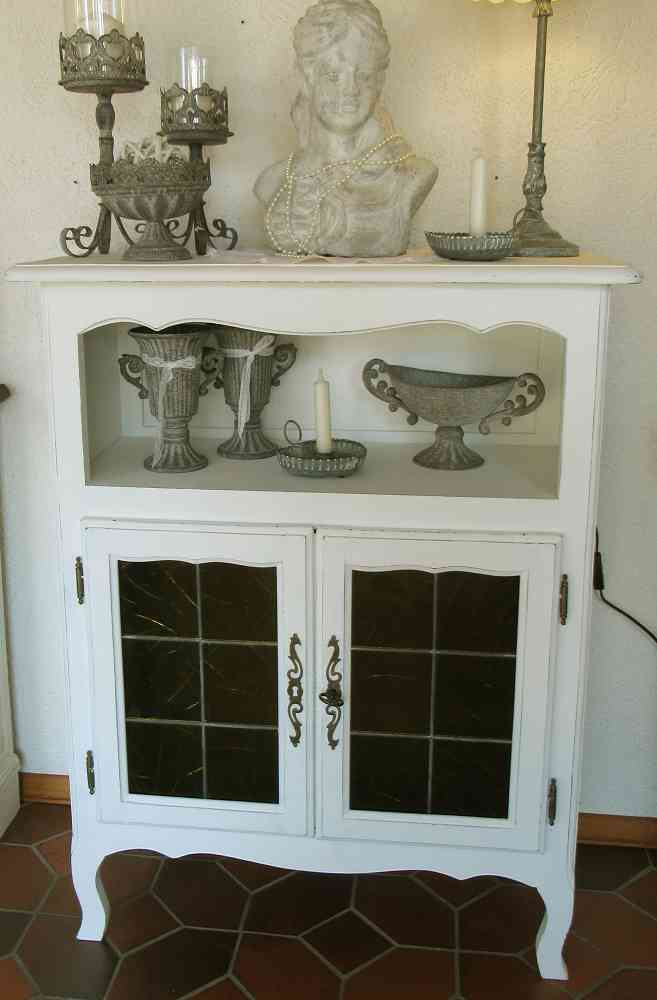 Vormals in dunkelbraunem outfit habe ich es mit mehreren Schichten Kreidefarben und Wachsen überarbeitet. Nun strahlt es im hellen, weißen Shabby Chic Look und freut sich auf ein neues Zuhause bei Ihnen. Es hat verspielte Holzteile, wie die Füße oder die Kante am offenen Fach und auch zierliche Beschläge an den Türen. Ein Schlüssel ist vorhanden.