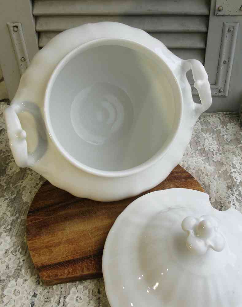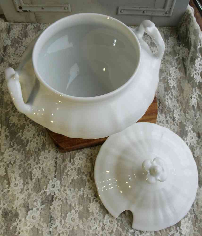 Diese antike sehr große Soupiere Suppenterrine mit Deckel hat eine tolle, bauchige Form mit leichten Verzierungen (Rillen). Die Griffe sind etwas nach innen geschwungen, der Deckel hat eine Öffnung für eine Suppenkelle.