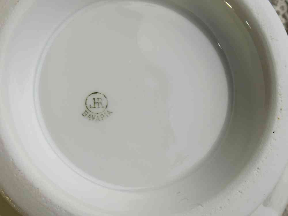 Der Boden ist gemarkt mit „L HR BAVARIA“ – wobei das „L“ spiegelbildlich an die beiden zusammengesetzten Buchstamben „H“ und „R“ angefügt ist (s. Foto). Dieser Porzellanstempel steht für die deutsche Porzellanmanufaktur „Lorenz Hutschenreuther“. Der Stempel wurde in den Jahren 1870 bis 1902 verwendet.