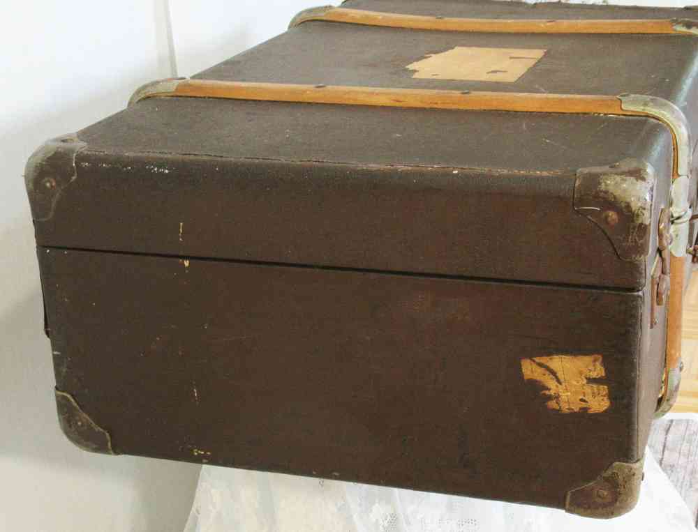 Der rel. große Koffer ist an der Außenseite aufwändig mit Bugholzleisten und schönen Metallbeschlägen verkleidet. Auch die Ecken sind mit speziellen Metallbeschlägen geschützt. Die Metallteile, besonders die Schlösser, haben in den letzen rd. 100 Jahren eine schöne Patina angenommen.