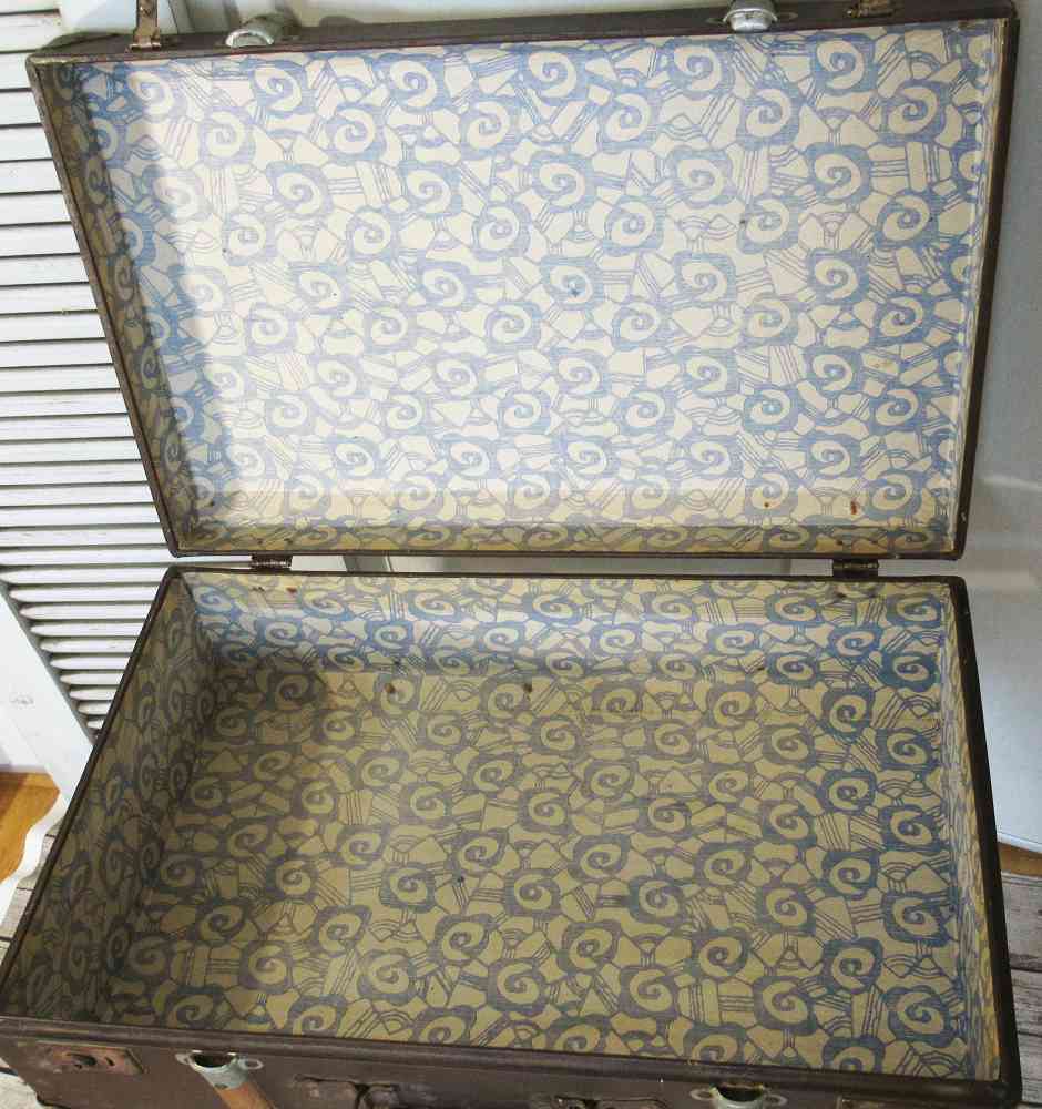 Leider sind die auf den Außenseiten befindlichen Aufkleber alle abgewetzt. Im Inneren ist er mit einem gemusterten Papier ausgeschlagen, welches sehr gut erhalten ist. (s. Fotos)