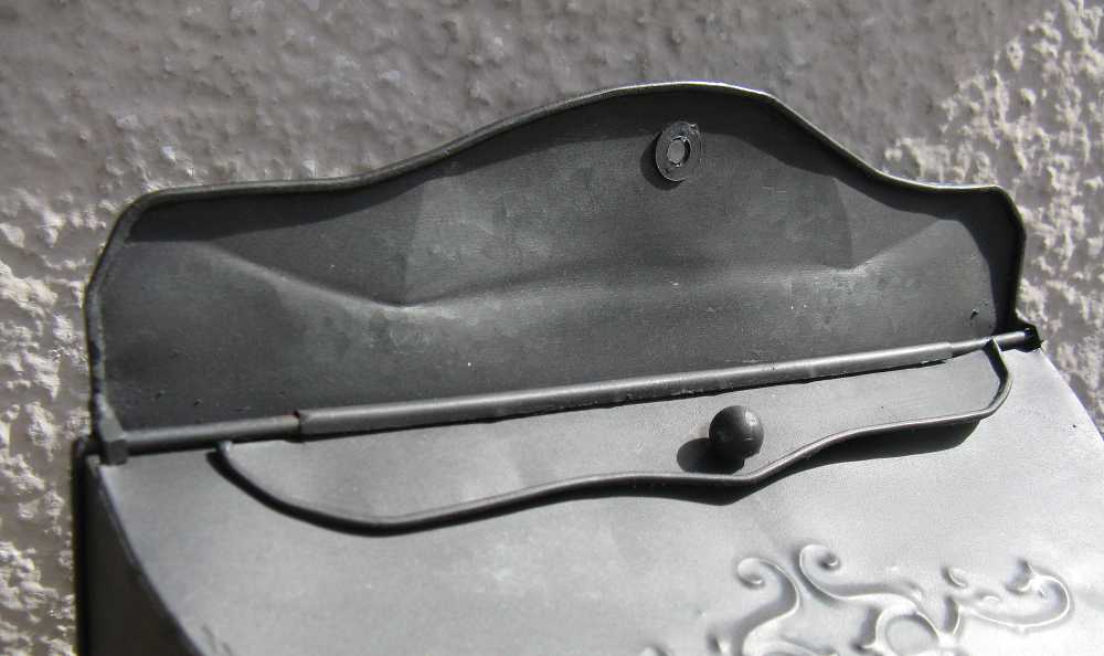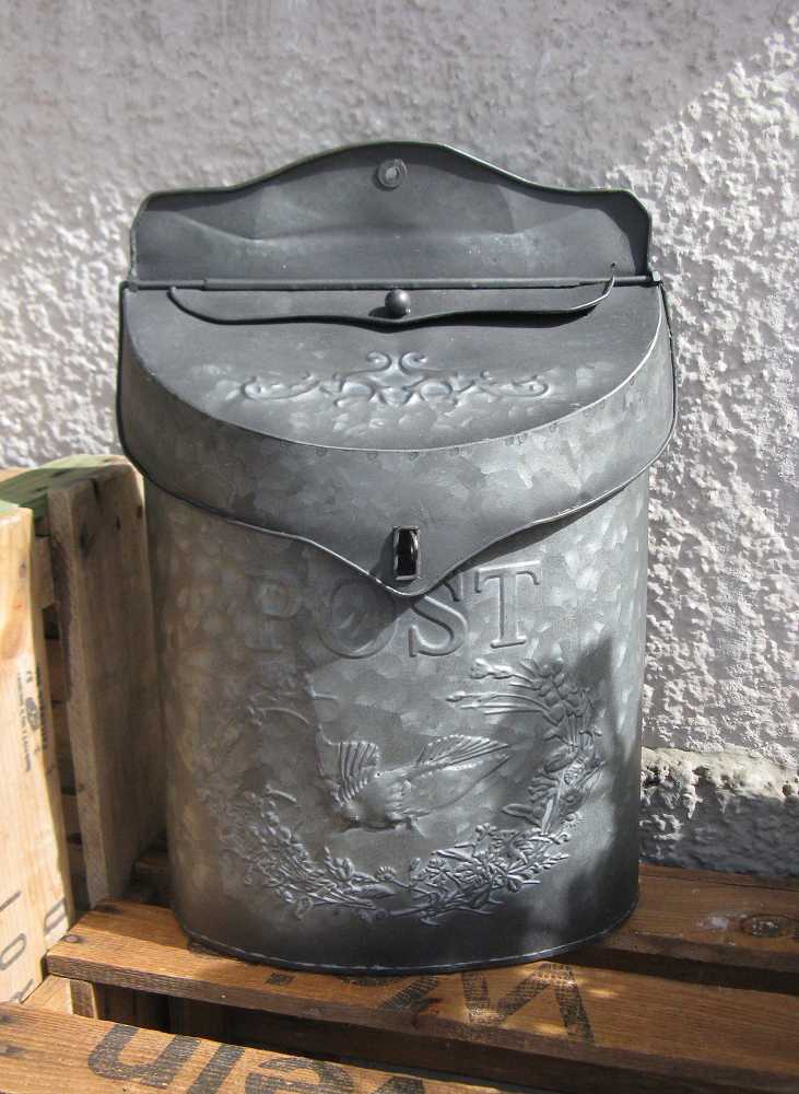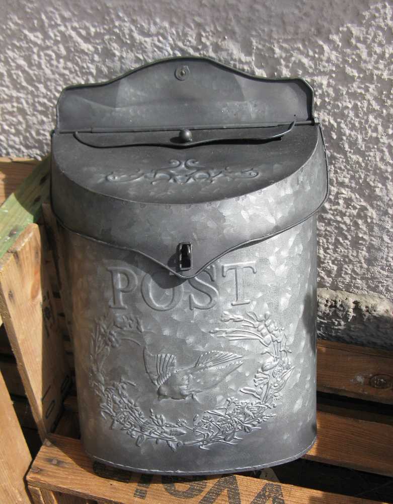 Dieser zauberhafte ’nostalgischer Briefkasten‘ ist nach dem Vorbild alter französischer Briefkästen gefertigt. Es ist aus leichtem Metall und hat eine große und eine kleine Klappe zum Öffnen. Die Front der halbrunden Form ist verziert mit einer Brieftaube einer Girlande und der Aufschrift ‚POST‘.