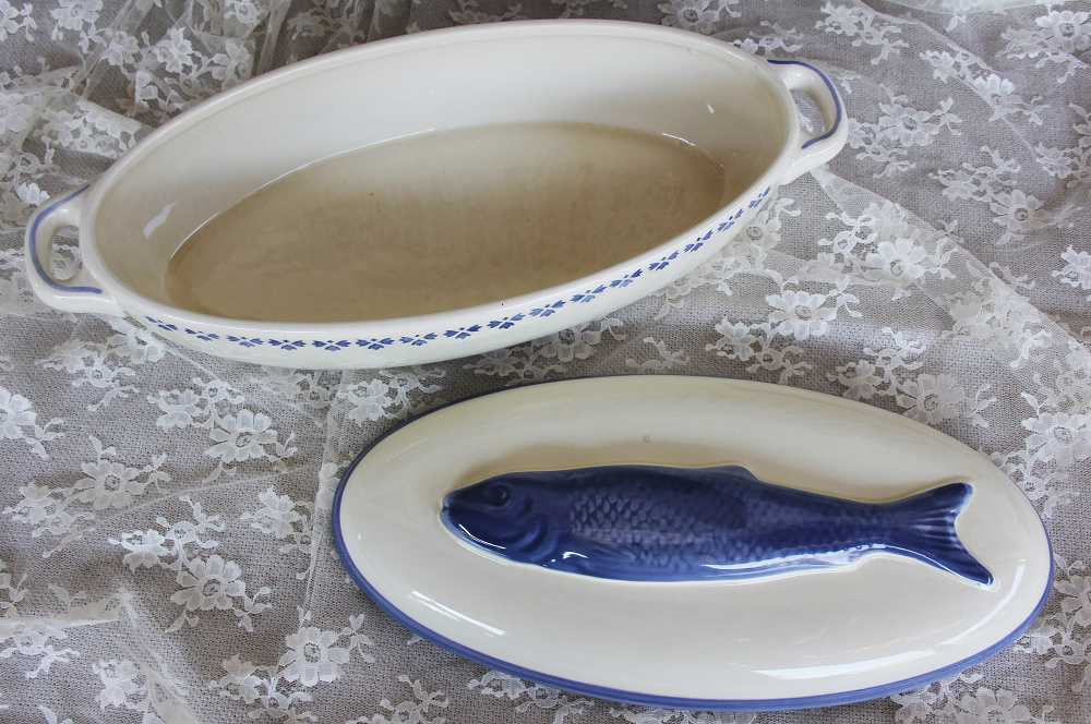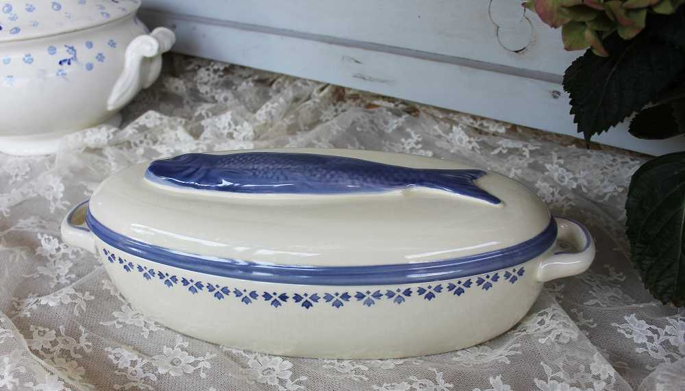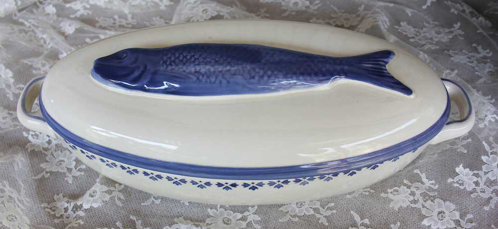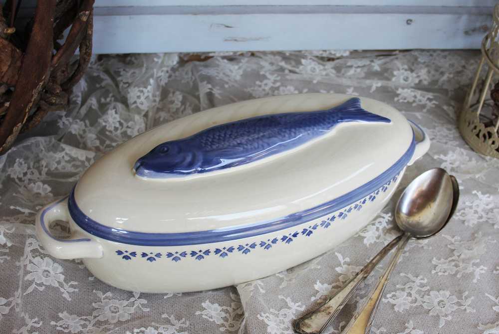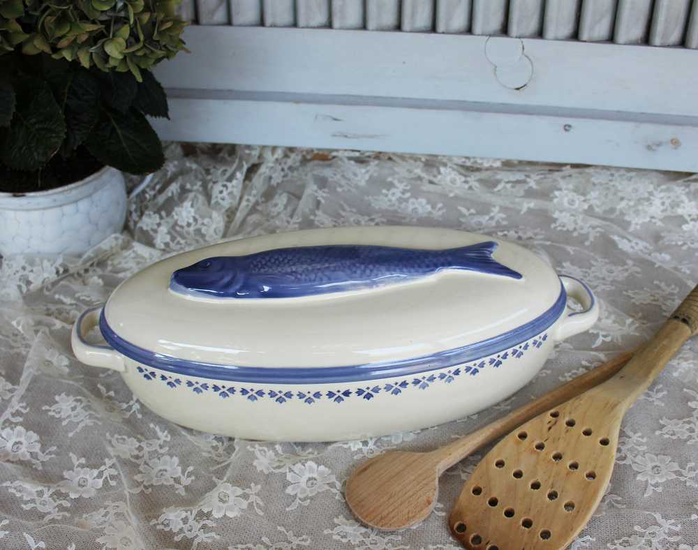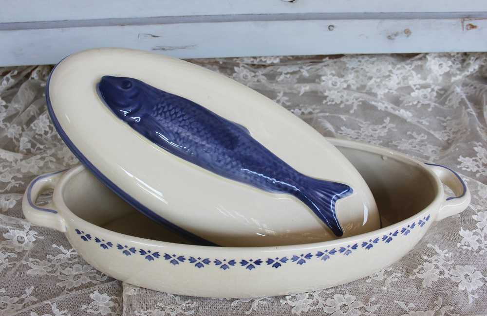 Die sehr alte Fischterrine Fischtopf handbemalt ist wie gemacht, um darin leckere Fischgerichte auf den Tisch zu bringen – aber auch mit anderen Auflaufgerichten sieht sie wunderbar aus.