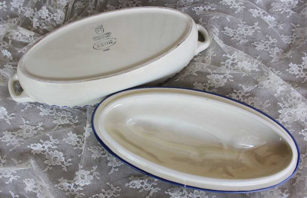 Nach der Art der Markung stammt diese Terrine aus der Nachkriegszeit – ist also rund 50 bis 60 Jahre alt. Dem tadellosen Zustand nach zu urteilen, wurde sie selten benutzt und sehr gut gepflegt.