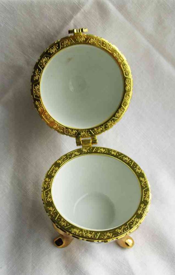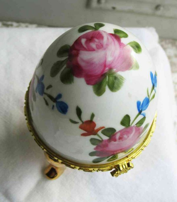 Das Ei ist aus weißem Porzellan mit handbemalten rosa Blüten verziert. Es steht auf drei goldfarbenen Beinen. Der Klappdeckel und der unterer Rand schließen mit einer goldfarbenen ziselierten Metallumrandung ab.